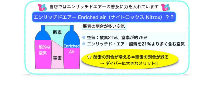 より安全に、そして安心してダイビングを楽しむために、 新しい知識に触れることの大切さと快適さを、ぜひ体感してください。当店はエンリッチドエアーの普及に力を入れています